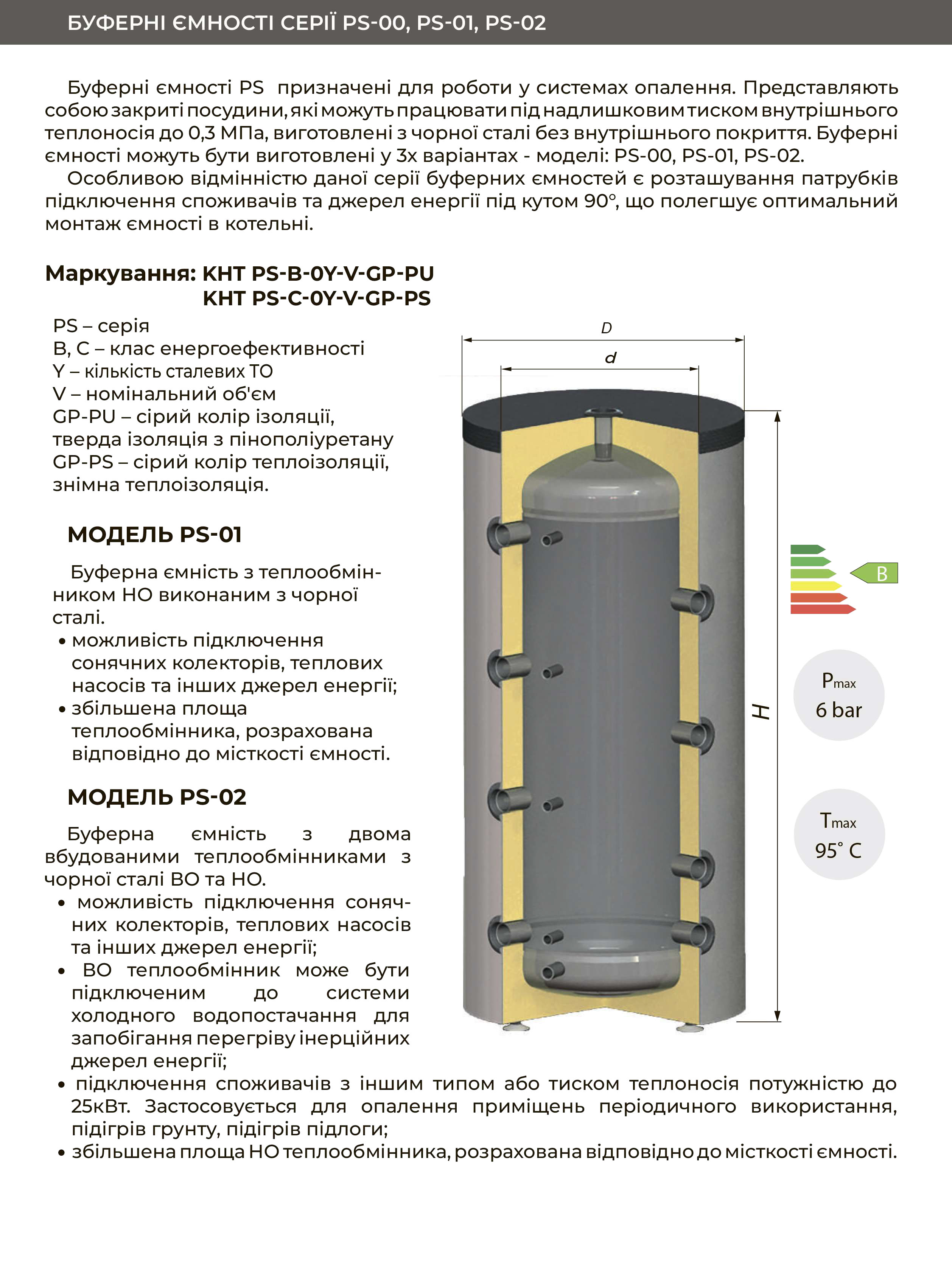 Буферні ємності PS-B  призначені для роботи у системах опалення. Представляють собою закриті посудини, які можуть працювати під надлишковим тиском внутрішнього теплоносія до 0,3 МПа, виготовлені з чорної сталі без внутрішнього покриття.