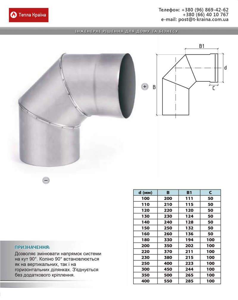 Коліно для димоходу 90° із нержавіючої сталі складається із трьох зварених між собою частин труби під певним кутом. Відвод виконує функцію повороту, дозволяючи змінювати напрямок димоходної труби. Даний виріб слугує для з’єднання труб.
