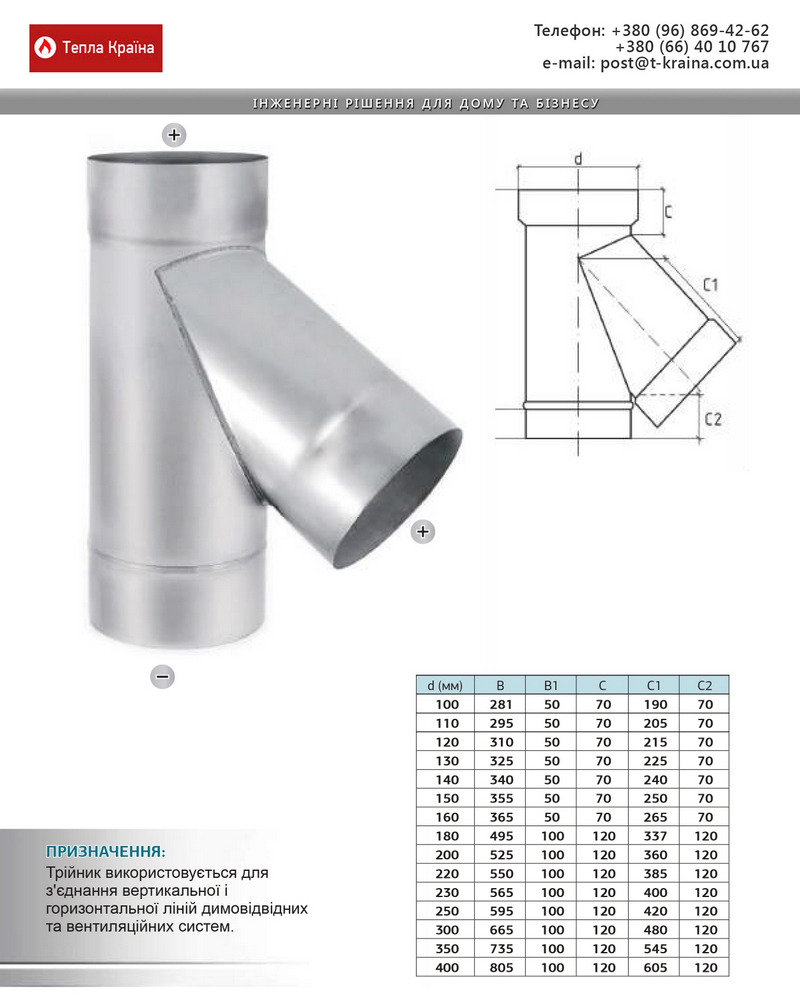 Трійник -виготовляється з кутами 45°, 87°, використовується для з'єднання вертикальної і горизонтальної ліній димовідвідних та вентиляційних систем.