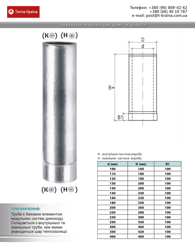 Труба утеплена -труба є базовим елементом модульних систем димоходу. Складається з внутрішньої та зовнішньої труби, між якими знаходиться шар теплоізоляції. Труба внутрішня виготовляється зі сталі: AISI 201, AISI 304, AISI 321. Зовнішний кожух виготовляється зі сталі AISI 201, або оцинкованая сталь.