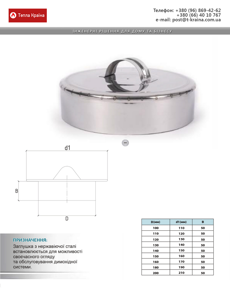 Заглушка з ручкою з нержавіючої сталі -встановлюється для можливості своєчасного огляду та обслуговування димохідної системи.