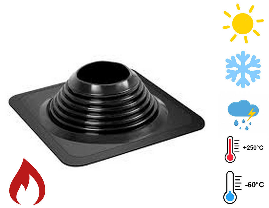 Майстер Флеш – покрівельна ущільнювальна манжета, що має високу еластичність. Є простим рішенням для герметизації проходу димоходу через покрівлю, при цьому забезпечує максимальне прилягання манжети до покрівлі, виключаючи протікання. Основне застосування майстер флешу (покрівельної манжети) явл. герметизація проходу димової труби через покрівлю. В залежності від кута покрівлі та різноманітності матеріалів для покриття дахів можна підібрати ущільнювальну манжету для Вашої покрівлі. Манжета – ступінчаста піраміда із заготовленими діаметрами (не потрібні діаметри відрізається) під діаметр Вашої труби. Також враховується нахил даху, тому манжети бувають: